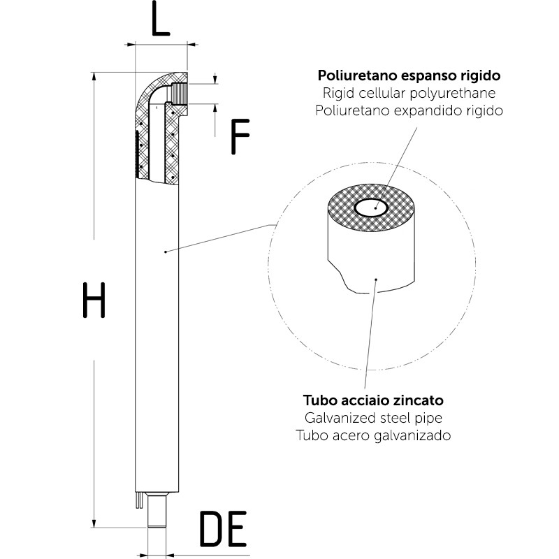Raccordo di transizione curvo con rivestimento antigelo in poliuretano espanso rigido e resistenza elettrica. Applicazionesu impianti antincendio per allaccio cassetta idrante. Uscita filettata femmina.