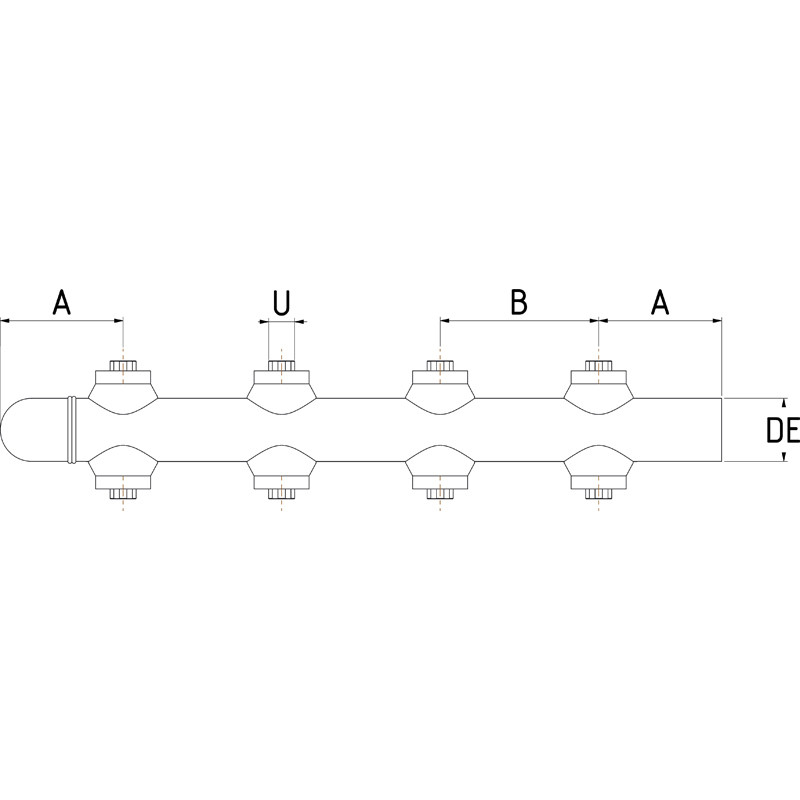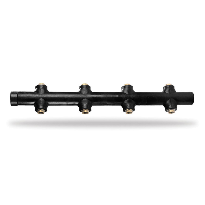 Collettore di utenza a CROCE di fine linea con terminale liscio per il collegamento tramite saldatura di testa o manicotto elettrosaldabile, uscite filettate. Si utilizza principalmente per il collegamento di utenze domestiche (contatori). Idoneo al trasporto di acqua potabile.
