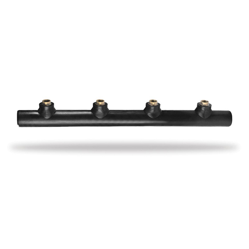 Collettore di utenza a TEE con terminalilisci per il collegamento tramite saldatura di testa o manicotto elettrosaldabile, uscite filettate. Si utilizza principalmente per il collegamento di utenze domestiche (contatori). Idoneo al trasporto di acqua potabile.