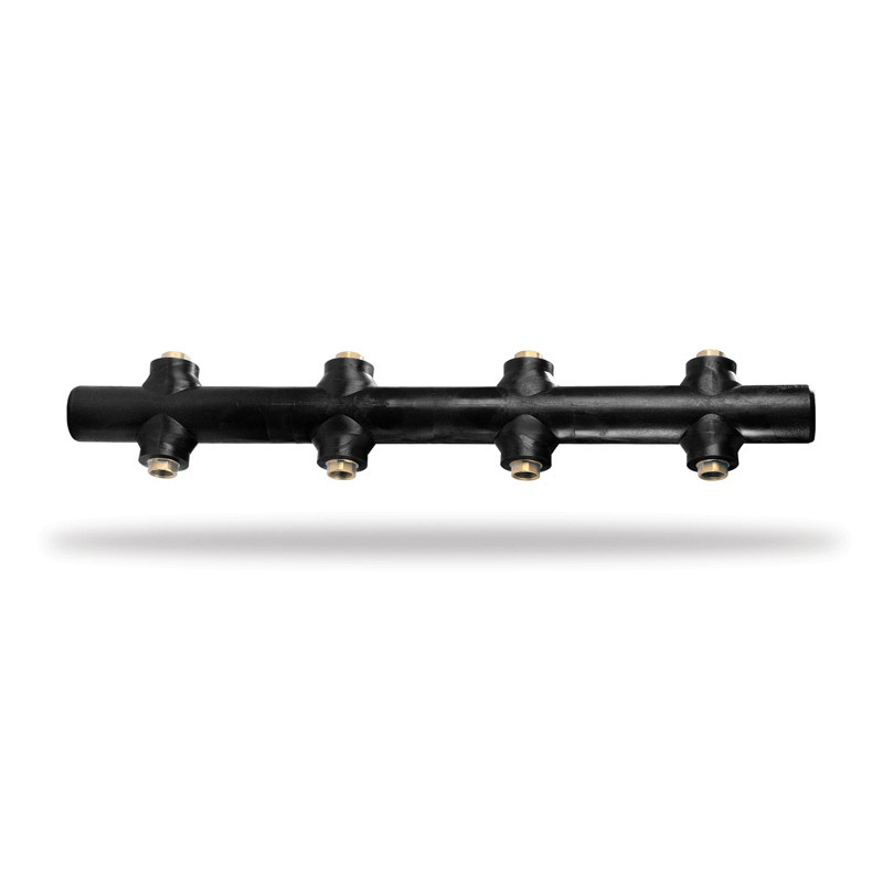 Collettore di utenza a CROCE con terminali lisci per il collegamento tramite saldatura di testa o manicotto elettrosaldabile, uscite filettate. Si utilizza principalmente per il collegamento di utenze domestiche (contatori). Idoneo al trasporto di acqua potabile.