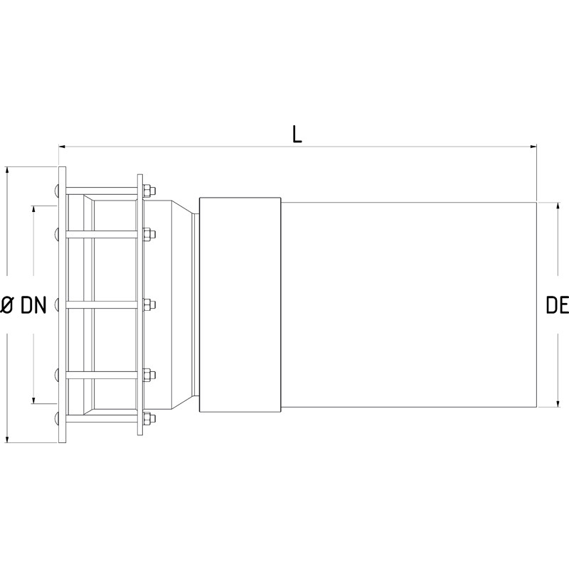Raccordo di transizione PE/multimateriale (ghisa, acciaio, PVC e altro). L'attacco universale permette l'inserimento di una tubazione con diametro compreso entro un certo range, tramite il serraggio dei bulloni la guarnizione blocca il tubo a tenuta. Utilizzabile su impianti per il trasporto di acqua di condotta o gas a basse pressioni, non funge da giunto antisfilamento.