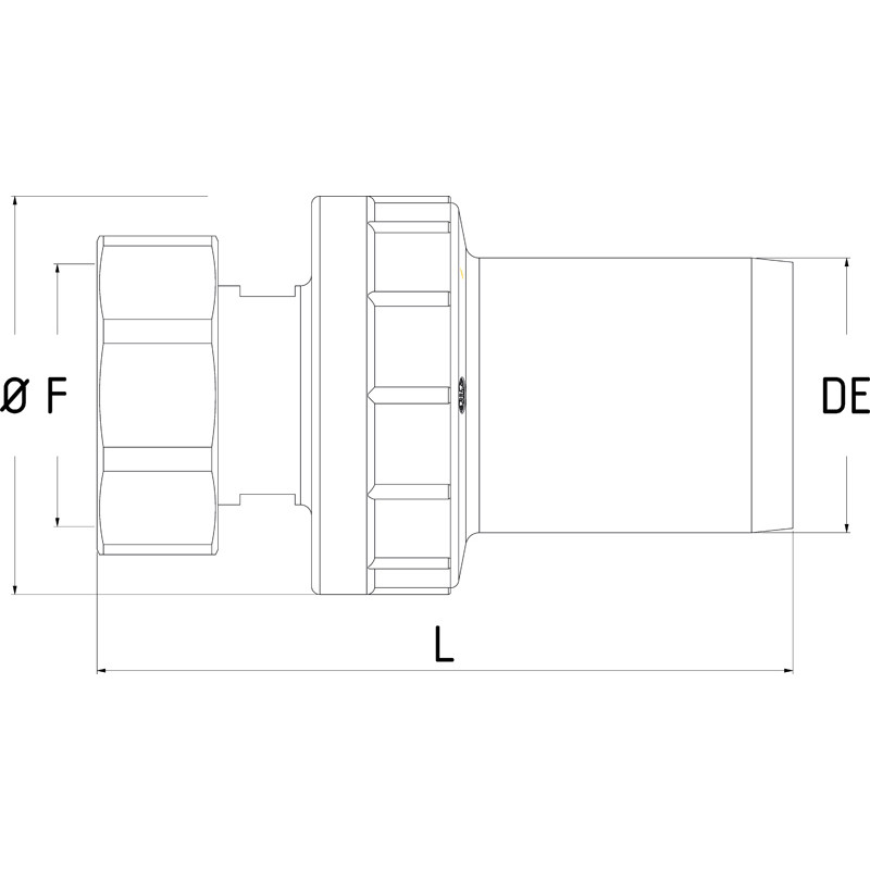 Adattatore di transizione PE/ottone con dado girevole filettato femmina. Realizzato tramite stampaggio ad iniezione, vieneimpiegato per il collegamento di materiali differenti (di cui uno sia polietilene) su impianti di tubazioni per il trasporto di acqua potabile.