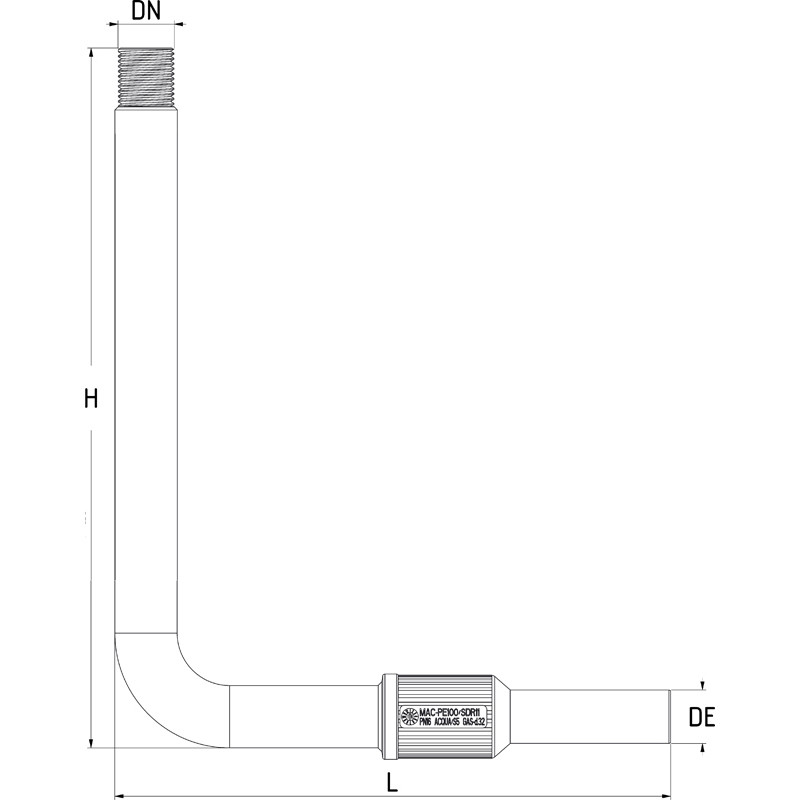 Raccordo di transizione PE/acciaio curvo con terminale filettato (versione personalizzabile dell'art.002). Realizzato tramite stampaggio ad iniezione, viene impiegato per il collegamento di materiali differenti (di cui uno sia polietilene) su impianti di tubazioni per il trasporto di gas combustibile.